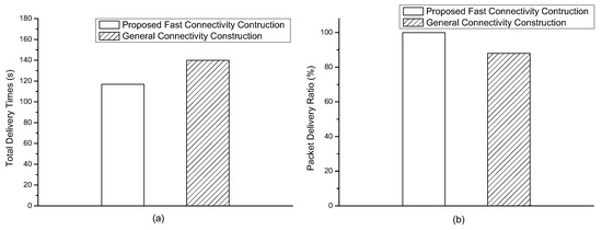 In Figure 5, 100 data packets are transmitted for analyzing the connectivity construction. As shown in Figure 5a, total delivery time of the general connectivity construction take a long time than the proposed scheme because the general connectivity construction maintains the link connection even though the state of the link is not good. In addition, there is a delay in which information to be sent cannot be transmitted for a reconnection time. On the other hand, since the proposed scheme is based on the MLP that can be used to detect the relative position when a specific signal combination is measured, the best link is selected. Therefore, in the case of D2D communication in which mobile nodes frequently reconnect, the proposed scheme can transmit data with low latency faster than the general connectivity scheme. In Figure 5b, the general connectivity scheme shows that the transmission ratio for packet data transmission is lower than that of the proposed scheme. The proposed scheme shows 100% of packet delivery ratio, while the general connectivity scheme shows 88% of packet delivery ratio.