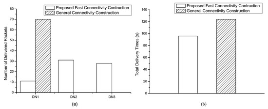 Figure 6a shows 70 data packets are transmitted while the mobile smartphone moves among DN1, DN2, DN3. The proposed scheme performs direct connection between devices to be transmitted irrespective of the link signal strength, and L3 transmission between nodes can be performed directly. Thus, it can be seen that 70 data packets are delivered directly to each DN. On the other hand, in the general connectivity construction method, data is transmitted only through the connection link to DN1, so both data to be sent to DN2 and DN3 are sent to DN1. Figure 6b measures the total delivery times to transmit the entire data with 70 data packets. The proposed scheme takes 96 s, whereas the general connectivity scheme takes 124 s of transmission time. This means that the proposed scheme shows performance improvement in relation to the transmission delay.