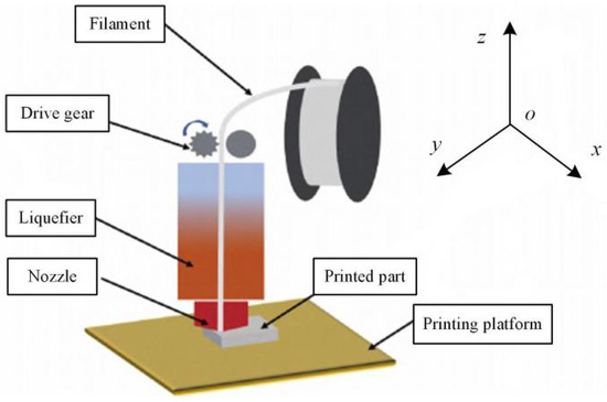 FDM is one of the most popular and ubiquitous AM methods because of its rapid production, cost-efficiency, ease of access, broad material adaptation, and capability to produce complex components [4,5]. FDM uses filament as its feedstock material. Such filaments can be manufactured by specific extruding machines or purchased from commercial brands [6]. The filament is pushed into the liquefier through a mechanism, heated to a molten state, extruded with a nozzle, then adhered to the formed layer. When the printing of one layer has been completed, the z-axis moves a certain distance equal to layer thickness in order to print the next layer, until the formation of the whole part is completed [7,8]. The principle of AM technology is shown in Figure 1.