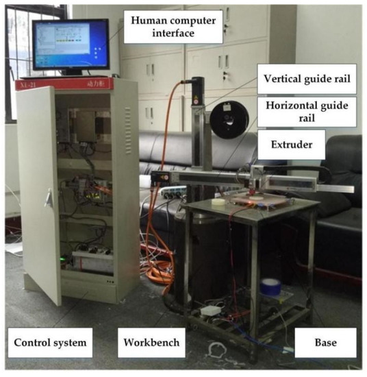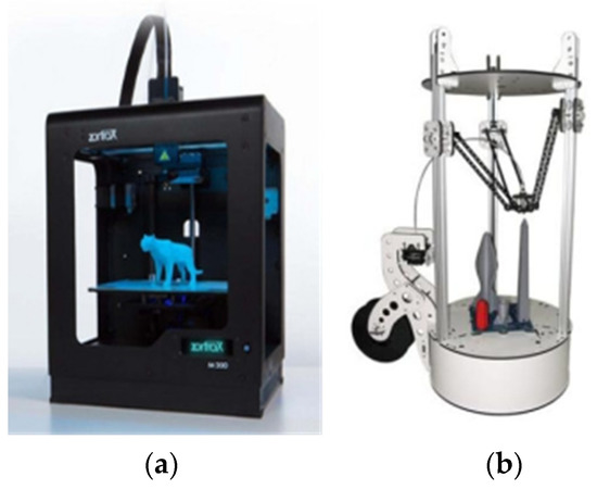 Conventional printers generally use a Cartesian structure or a parallel structure, as shown in Figure 2. The printing temperature of such printers is below 300 °C, which requires a low forming temperature of materials. When the filament is deposited through the nozzle layer by layer to form a part, the bonding strength between two layers affects the mechanical properties of the part. Because the materials used in FDM also need to have a certain melt strength, the adhesion between layers should be good, so as to avoid cracking caused by thermal stress or a low melt viscosity between layers [12,13,14].