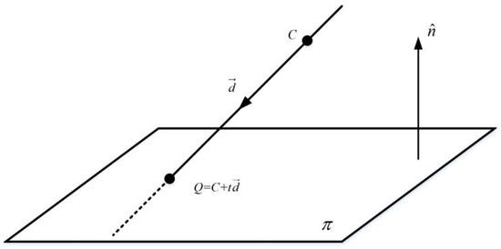 Assuming that a straight line and a plane intersect at a point Q, the intersection Q satisfies Equations (2) and (9). Equation (2) is substituted into Equation (9) as follows:
