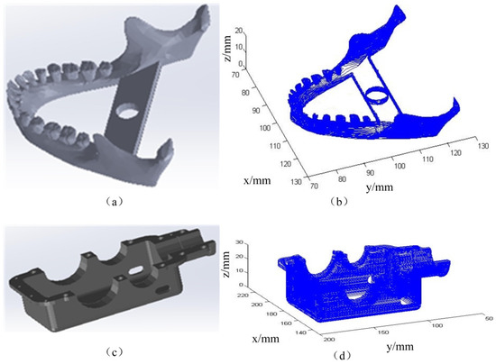 STEP modes and their slicing simulation results. (a) STEP model of the lower teeth; (b) slicing simulation of the lower teeth; (c) STEP model of the gearbox base; (d) slicing simulation of the gearbox base.