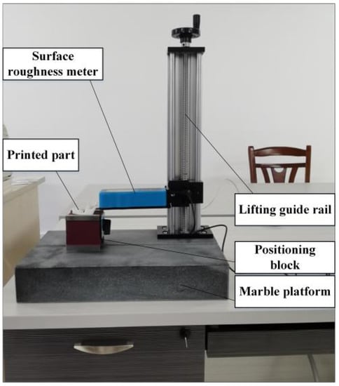 The surface roughness of the lower teeth was measured on the platform of a surface roughness meter, as shown in Figure 9. The arithmetic mean deviation of the profile (Ra) and the maximum height of the profile (Rz) were used as the evaluation parameters of the surface roughness. For FDM technology, the parts are formed by stacking layer by layer using the hot melting and adhesion of thermoplastic print materials. With the increase of the print height, the side contour and shape of the printed parts will change slightly under the influence of gravity. Therefore, the surface roughness of their sides is slightly higher than that of their upper surface. For the printed lower teeth, ten positions on the upper surface and side, respectively, were selected. The surface roughness of these positions was measured, as shown in Table 2. In order to better evaluate the surface roughness objectively, the sample’s mean, standard deviation and coefficient of variation (also called the relative standard deviation) were used for evaluation.