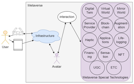 Figure 1. Metaverse framework. - Any user who wants to use a metaverse-based application should start from the app or interface connected to the metaverse. The app or the interface will work as the gate to the metaverse, which may have another form of technology in the future.