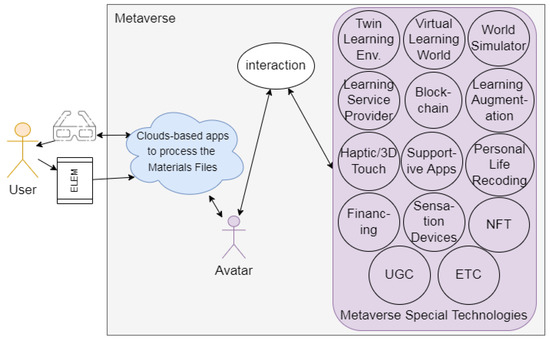The metaverse has a framework that affects all the applications uploaded to the metaverse. This effect contains how the user deals with applications and how to manage these applications. Without knowing the framework of the metaverse clearly, the applications will be at the risk of being outdated, even if they were developed recently, because of using obsolete technologies. The apps that do not run on the metaverse will be abandoned shortly, as the metaverse is the future of the Internet. As a result, all the applications should adopt this new technology, and on top of it is E-Learning systems. Considering the framework of the metaverse proposed by Duan to implement CUHKSZ as a social campus application, ELEM recognizes the interaction part as a connection between the physical infrastructure and the metaverse special technologies. It ensures the simplicity of development, publishing, and maintenance. It also has the benefit of the metaverse framework. We can summarize the need of every special technique of the metaverse as follows: