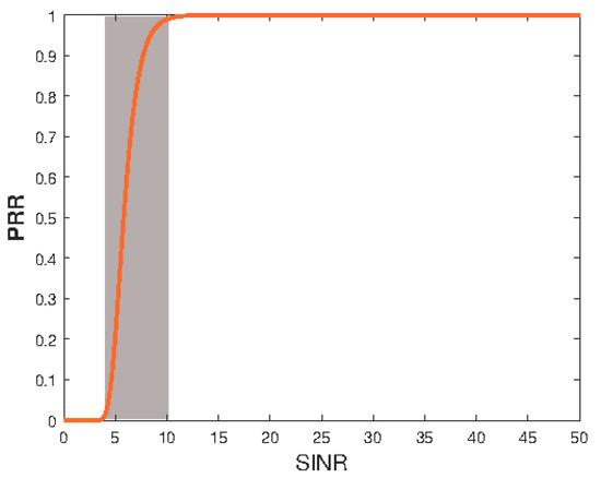 By increasing the the transmission power, it is expected that the SINR will also be increased. However, when the transmission power is set to a significantly high level, interference from the other users, , makes the PRR decrease. When we have no interference, the PRR goes rapidly to maximum 1. In Figure 2, we see the increase of the PRR with the increase of the SINR without the presence of interference, where it follows the sigmoidal function. Note that for and , which is true for a packet with reasonably large number of bits. Thus, SINR values that belong in the grey area do not exhibit stable PRR estimation. For this reason, our simulation results will be based on more practical definitions of PRR.