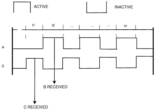 As such, increasing the rate of such configuration will further increase the throughput of the network and maximise Equation (5). In conjunction with the transmission powers and , the rates of the nodes in the subsets are , by using the maximum transmission power that satisfies the constraints. This is due to the maximum rate including the maximum , as we can see from the constraints of (5) when interference is mitigated or diminished using duty cycling, as we can see in Figure 4. □