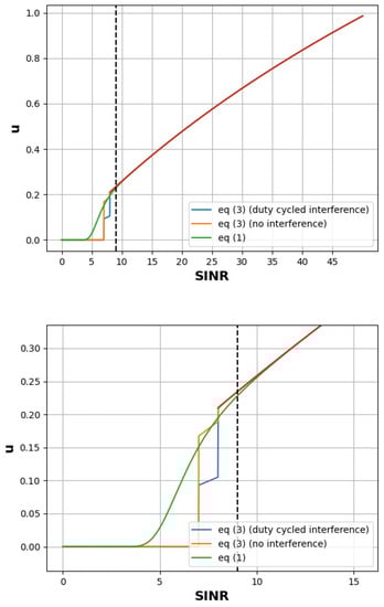 The reader can see the results of the plots of Equations (1) and (17). For the latter, we included the cases with no interference and duty cycled interference in Figure 5. Here, with the red color, we see the utility when the constraints are satisfied. The best case Nash equilibrium is the one with the highest SINR. Moreover, we plotted the curve of Equation (1) and the plot for the duty cycled interference from Equation (17). For the latter, we see that with the increase of the SINR, the PRR increases from the grey area to the maximum and then the rate is maximised after the PRR being 1. This takes place since the PRR can be one with lower than the maximum SINR. Furthermore, the zoom of the plot can be seen directly below the figure to see the change in the .
