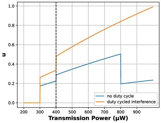Moreover, the utility function u was plotted against the transmission power levels in W in Figure 7. The purpose of this experiment is to indicate the difference with the duty-cycled and not duty-cycled case. As the reader can see in Figure 7, there are two cases: the one being with duty-cycled vehicles and the other without the duty-cycled mechanism. The interference in this example is initially set to 300 W. In the duty-cycled case, the interference remains stable throughout the experiment, and the PRR goes from 0 to 0.9 and then to 1.0. On the other hand, in the not duty-cycled case, there is an increase in interference reaching 500 W at the 800 W transmission power utilised. Moreover, since we experience packet loss from interference, the PRR goes from 0 to 0.6, and then it falls to 0.35.