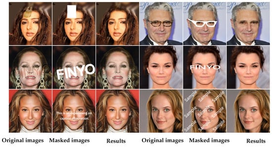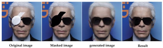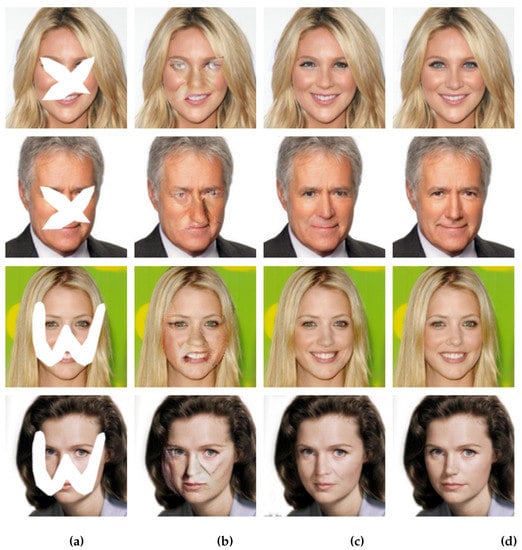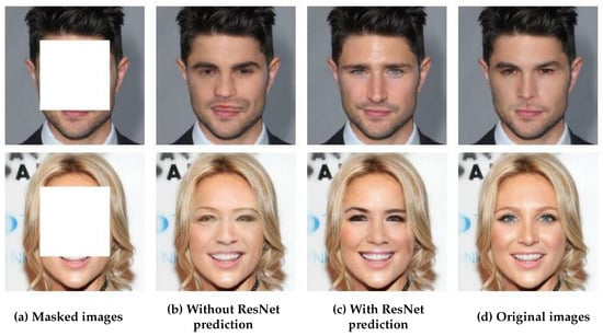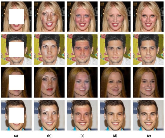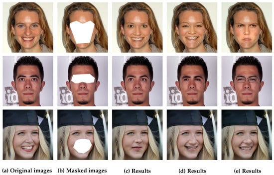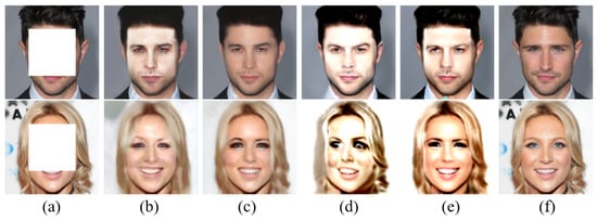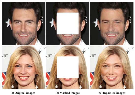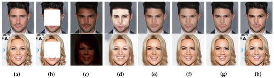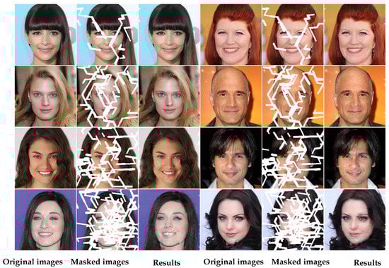 Specifically, in the follow-up experiments, we completed the inpainting of high-resolution face images through a combination of four losses: , , and . The overall loss function is shown in Equation (11).