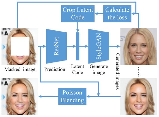 Although these methods have achieved good results in face image completion, the use of high-resolution face data sets makes network training difficult and the generation of credible high-resolution images challenging, leading to suboptimal repair of high-resolution face images. Karras et al. [] proposed StyleGAN, which can generate high-resolution face images gradually.