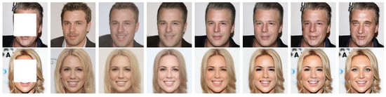 In this way, by editing the latent vector , we can achieve the generation of face images with different attributes, such as facial expressions. Then, the image to be inpainted and the generated image are fused by the Poisson fusion method to achieve the diversity of repair results. Figure 17 shows the diversity inpainting results we obtained by editing the latent vector.