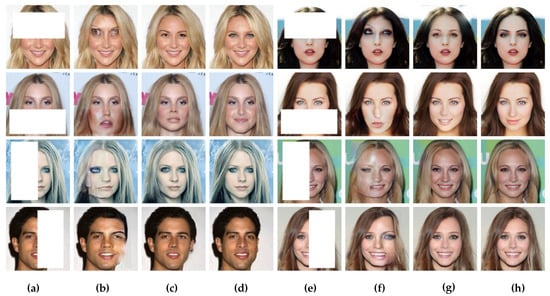 The second type of experiment describes the inpaint of face images by combining different types of loss functions. The experimental results of two groups are shown in Figure 5. The amazing inpainting results can be clearly seen, and are obtained through the combination of various loss functions (as shown in Figure 5g). After generating high-resolution face images by using various loss functions, the generated images must be processed to complete the entire inpainting work. A simple processing method is to directly paste the to-be-repaired area corresponding to the generated image into the to-be-repaired image. This processing method can cause boundary marks to appear in the final inpainting results. In experiments, we process the inpainting boundary via Poisson mixing [] to make the boundary of the final inpainting results more natural (Figure 5h).