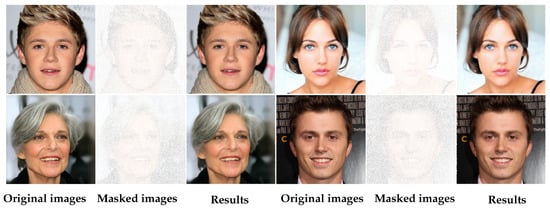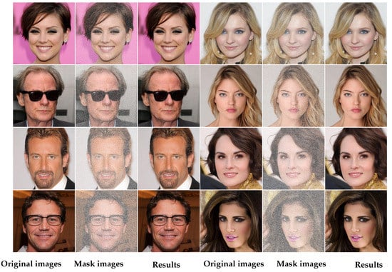 The method proposed in this paper does not need to retrain the model for different repair areas. Thus, it can repair images of any mask easily. In our experiments, we repair the images under different damage conditions, with the experimental results shown in Figure 10 and Figure 11. Figure 10 shows the completed results of images damaged by 20%, 30%, 40% and 50% random noise masks. We can see that in the case of 20% and 30% noise masks, the completed results are not visually different from the original images, and in the case of 40% and 50% noise, the completed results are only slightly blurred. Figure 11 shows the completed results of images damaged by free-form brushes accounting for 10–20%, 20–30%, 30–40% and 40–50% of image pixels, the conclusion is still consistent with Figure 10. We also try to repair the image damaged by 90% random noise masks, our method can still achieve good repair effect, as shown in Figure 12. Therefore, our method can effectively repair face images with random damage.