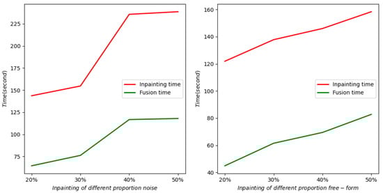 In Figure 14, we show the average completion time of 1000 face images with random noise masks and random free-form brush masks. The completion time of each image includes the time of repair phase and fusion phase. It can be seen, the difference in completion time is caused by the fusion stage. As shown in Figure 14, the completion times of inpainting images with random noise masks are longer than that of the random free form brush masks, which is mainly due to the images of random noise masks need more fusion time because random noise is more dispersed. The average completion time of repairing a face image with 20% free-form brush masks is 122 s. The average completion time of repairing a face image with 20% random noise masks is 143 s. Nevertheless, the cost of these time can still meet the requirements of practical application.