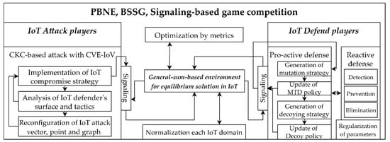 As shown in Figure 1, the dynamic game-based foreground components typically consist of a PBNE, BSSG, partial signaling-based general sum game competition module and an attack–defense strategy module to define the state-transition probabilities by the actor. As shown in Figure 2, the general sum game competition module adopts all of the PBNE decision strategies to maximize the payoffs by an episode of private asymmetry based on incomplete information by attacker and defender, the BSSG decision strategy to optimize the quantitative sequential relationships of micro or macroscopically calculated reward values as an active leader and reactive follower-based causality, and the partial signal game decision strategy to actively force attackers’ prior beliefs and confusion and maintain and sustain defender-dominant leadership. The attack–defense strategy module refers to all of the IoT devices formulated by smart home IoT, industrial IoT, and medical IoT-based organizational scenarios defined in advance in the IoT-enabled scenario template, systems, sub-farm networks, intercommunication channels, operational strategies, CVE vulnerabilities, and CVSS scores to formulate the target, tactic, and sequence-based attack–defense flows produced by the actor as threat modeling.