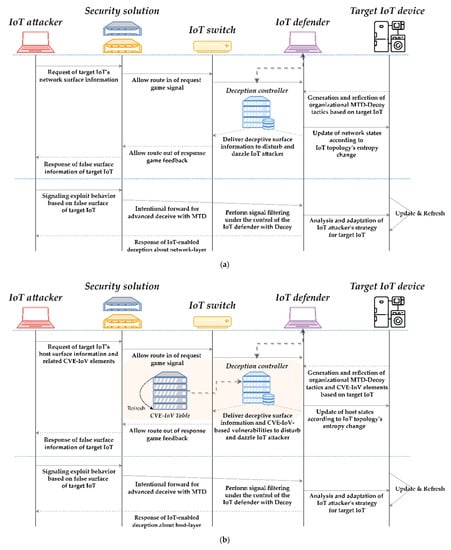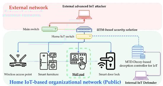 As the utilization of generalized heterogeneous IoT systems increases throughout various industries, sensitive sensor data and high authorities are frequently abused in static communication environments without applying any separate security measures, and the vulnerable attack surfaces of interconnected passive IoT systems and attacker dominant asymmetries continue to increase [1,2]. Most cybersecurity problems that occur within the IoT systems and networks are due to unique characteristics such as the passivity and heterogeneity of IoT devices, dependence on decision processing, low computational processing and resource allocation functions, and environmental hostility related to the application of existing security solutions [3,4,5].