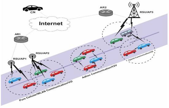 Vehicular ad hoc networks [1], consisting of high-speed vehicles along with stationary objects, are infrastructure-neutral, distributed heterogenous wireless networks. Communication in VANET may be either vehicle-to-vehicle (V2V) in which two vehicles can communicate directly or using multi-hop communication, whereas in vehicle-to-infrastructure (V2I) [2], vehicles and fixed infrastructure known as roadside unit (RSU) [2], such as base station, mobile router (MR) and access point (AP) communicate with each other. A typical VANET communication scenario is shown in Figure 1. Pure ad hoc communication (V2V), pure cellular/WLAN (V2I) and hybrid communication (V2I) architectures are three possible types of communication architectures in VANET. Pure ad hoc communication permits communication via a single hop or multiple hops and stands to vehicle-to-vehicle (V2V) communication. In pure cellular/WLAN, communication between vehicles and fixed roadside unit takes place, which is referred as vehicle-to-infrastructure communication (V2I). On the other hand, the hybrid architecture, consisting of a vehicle with moving router (MR), permits the hybrid vehicle (HV) communication mode in which multi-hop routing may be used to connect the vehicles to RSU, with other vehicles acting as gateways.