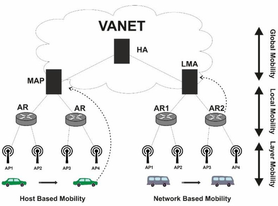 Mobility management [3,4] is one of the most significant and difficult concerns for VANET. Serving networks can use mobility management to detect a vehicle’s point of attachment (location management [5]) and maintain a vehicle’s connection while it travels around (handover management [6]). Because of the distinctions in the above three communication architectures, the mobility management solutions for each can be developed differently to achieve the better results. The Internet engineering task force (IETF) has specified numerous standards which were used for developing various protocols for mobility management. These protocols are categorized either into host-based mobility management protocol where host is involved in mobility signaling to provide global mobility or into network-based mobility protocols in which network handles the localized mobility, as shown in Figure 2.