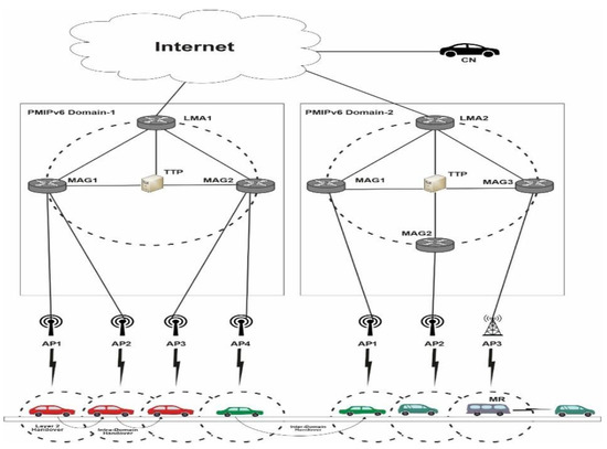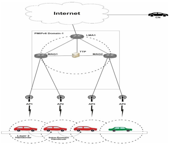 The MAG, which work as an access router (AR), has a responsibility to detect the movement of vehicle. On detecting the movement, MAG starts the necessary actions required for handover with the vehicle’s LMA. It does so by sending a proxy binding update message (PBU) to LMA, the gateway of the PMIPv6 domain. Furthermore, LMA and MAG are connected by a tunnel to utilize the vehicle’s address from its HNP. All traffic meant for a vehicle passes via the LMA, which serves as an anchor point in topology. It is responsible for maintaining the routing and vehicle accessibility within the PMIPv6 domain. LMA additionally maintains the binding state of each registered vehicle via binding cache entry (BCE) [13,14]. The BCE includes the vehicle’s identification, its HNP, a proxy registration flag, and also the tunnel’s established interface identification. LMA also verifies the authorization status for each MAG. In PMIPv6 domain, when point of attachment of a vehicle changes, the handover may be either a Layer 2 handover, an Intra-domain handover, or it may be an Inter-domain handover. When a vehicle switches access points within the same MAG, this is known as a Layer 2 handover. The LMA is unaffected by this change because the MAG modifies the vehicle’s binding locally. When a vehicle switches its point of attachment between two MAGs attached to the same LMA, an inter-domain handover occurs. By switching PMIPv6′s handoff signaling, the MAGs keep the vehicle bound to LMA, whereas in inter-domain handover, the vehicle’s attachment points shift between two MAGs connected to distinctive LMAs. Only intra-domain mobility roaming is managed by the PMIPv6 protocol. In PMIPv6, several strategies for handling handover have been presented. In 2012, a Clustered SPMIPv6 [15] was offered as an improved architecture. They used the method of grouping the MAGs into clusters, each with its own cluster Head MAG (HMAG). By executing intra-cluster handoff signaling and providing an efficient path for data connections, the HMAG minimized the strain on LMA. In terms of LMA load, local handoff latency, and transmission cost performance measures, they compared the analytical and numerical results of CSPMIPv6, SPMIPv6, and PMIPv6 protocols. In 2014, for PMIPv6 networks [16], the authors have developed a mobility-aware Dual Pointer Forwarding system. According to them, their mobility-aware binding improvements can reduce packet delivery overhead. They also calculated the cost of binding updates and packet delivery for route optimization and discovered that their system outperformed PMIPv6 and other pointer forwarding techniques in terms of total signaling costs. The effect of optimal pointer chain length and SMR was also looked at. Finally, when compared to PMIPv6 and PF, the proposed PF technique outperformed both in terms of performance and total cost. Another work proposed the constrained application protocol that was based on group mobility [17] and was supposed to support mobility in a web based IoT scenario. One sensor that is responsible for communicating the body sensors’ control signals to the web-of-things mobility management system Two sorts of IP addresses, one permanent address used for the sensor IP address, and a temporary address used for the Access Router address. According to the results of their numerical analysis, their proposed protocol outperforms the existing constrained application protocol without group. In 2019, the authors proposed the AE-PMIPv6 scheme [18], which used the BCE at the LMA, as part of the PMIPv6 protocol. They’ve consolidated the MNs’ BCEs, resulted in a reduction in signaling overhead. During the MN’s enrolment phase, the planned AE-PMIPv6 system contained the idea of leveraging virtual addressing and addressing pool methods, allowing the MAG to combine the MNs’ binding information and issue HNPs ahead of time. Furthermore, the proposed approach allowed the MAG to combine the data of such MNs into a separate BUL, as well as the LMA to combine the required HNPs into a single BCE, resulting in better resource utilization and decreased buffering costs. They devised a mechanism for delivering a seamless changeover for MNs in the urban traffic network. The new approach’s potential to reduce network signaling costs and buffering latency has been proved through simulation. Finally, the proposed system was able to obtain HNPs prior to MN handoff/registration by exploiting the addressing pool technique, reducing both signaling costs and handoff latency. The simulation results demonstrated that AE-PMIPv6 outperforms the E-PMIPv6 scheme in respect of buffering cost, signaling cost, and handoff latency. The authors, in 2019, proposed a mobile node group-based handoff technique [19] that minimized handover during travelling. Enhanced Cluster Sensor Proxy Mobile IPv6 combined two strategies to provide a quick handover solution. The first strategy, cluster mobile nodes moving in a group will be allowed in advance before their actual handoff and second method allowed to modify the mobile node’s mobility-related signaling during their handover signaling. In comparison to current mobility management processes, they claim that the efficiency of their scheme has been verified by comprehensive simulation tests and numerical analyses.