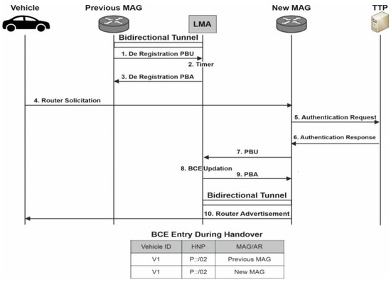 In Figure 5, the sequence diagram of message exchanged among various entities, when in intra-domain handover a vehicle changes its attachment point. In step 1, The preceding MAG initiates the disengagement process by sending a deregistration request to LMA via a PBU signal. The LMA then set a timer to complete the handover process in step 2. It then waits for the threshold period for a binding update request from the new MAG before removing the vehicle’s entry from BCE. Upon receiving the request from new MAG, it then sends the PBA message to previous MAG requesting the vehicle binding status to be removed in step 3. In step 4, once new MAG seeks attachment via router solicitation message from vehicle, it sends the authentication request to TTP for the authentication of the vehicle (steps 5–6). The PBU message is then sent to LMA by the new MAG (steps 7–8) and vehicle’s BCE is then updated by tying the same HNP to the new MAG. In step 9, LMA delivers the PBA message to the new MAG. Thus, constructing a new bidirectional tunnel between the LMA and the new MAG. After then, the new MAG then sends the vehicle a router advisement message consisting with the same HNP (step 11). Because the HNP remains intact throughout transfer, the vehicle will be completely oblivious of the entire operation.