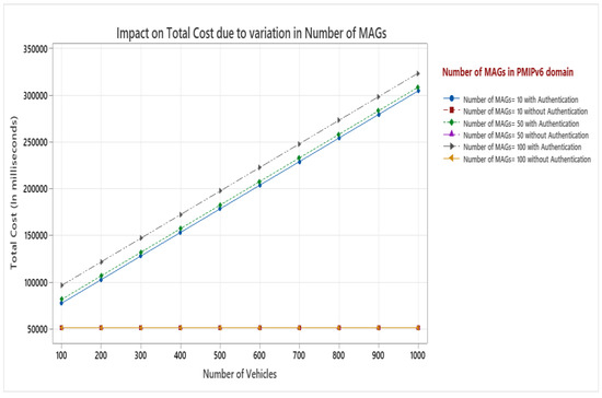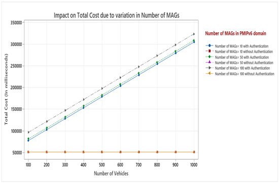 The most appropriate parameter to assess the effectiveness of mobility management techniques is signaling cost. The quantity of control messages sent between network elements such as MAG/LMA and vehicles determines this. A PMIPv6 domain contains a LMA as mobility anchor point for the vehicle and various MAGs which servers as access router for vehicles. As vehicle enters PMIPv6 domain, it sends the registration request to MAG via authentication from TTP, and MAG forward the authenticated request to LMA. The total cost in PMIPv6 domain for VANET is the summation of the costs of binding update, authentication, and packet delivery represented by Equation (13). During the movement, a mobile vehicle performs intra domain handover while changing its attachment point from one MAG to another. Hence, number of MAGs in PMIv6 domain plays an important role for analysis. Figure 7 shows the impact on total cost with authentication cost and without authentication cost by increasing the number of MAGs and number of vehicles in PMIPv6 domain. The diagram depicts that as the number of MAGs and vehicles grow the total cost also increases proportionately when authentication cost is considered. This is due to authentication process of MAGs as well as vehicles. However, when authentication cost is not included, the number of MAGs and number of vehicles do not have an impact on total cost. Wired links are more reliable as compared to wireless link. Here, the transmission cost on wired link is represented by, and we have varied its value from 1 to 10 in terms of hop counts.