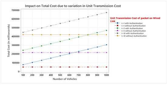 Figure 8 depicts the consequence of variations in unit transmission cost and vehicle count on total cost when authentication cost is included as well as when it is not included. When authentication cost is not considered for calculating the total cost, number of vehicles does not have impact on total cost. On the other hand, when authentication cost is involved both the unit transmission cost and number of vehicles have significant impact on total cost. The increase in unit transmission cost of a packet on a wired link (hop), from 1 to 10 increases the total cost in the same proportion.