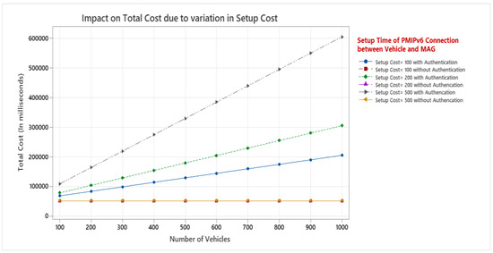 To establish a communication link, a set cost is necessary. It includes wired and wireless links both. Wireless links are unreliable that is why requires more time to establish the communication channel, i.e., setup. Figure 9 depicts the impact of the setup cost on the total costs with authentication and without authentication cost. In our analysis, we have varied setup cost from 100 to 500. when authentication cost is considered, the total cost increases significantly when setup cost increase from 100 to 500 along with increase in number of vehicles from 100 to 1000. LMA is network entity having high end processing capabilities. While calculating the total cost, the setup cost and number of vehicles have no impact on total cost when authentication cost is not involved.