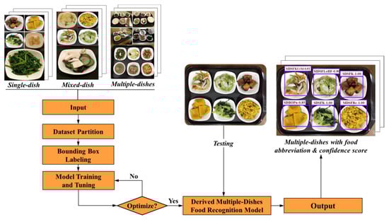 The designed multiple-dish food recognition model is detailed and explained in this section. Three types of meals—single-dish, mixed-dish, and multiple-dish—were considered as input. These inputs were divided, labeled, trained, evaluated, and tested. The overall workflow of the proposed model is shown in Figure 1.