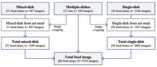 For this study, the dataset of food images was taken with smartphone and collected in a real environment, i.e., at the cafeteria of Chang Gung Health and Culture Village. Following our previous study [29], we categorized the meals into mixed-dish, single-dish, and multiple-dish, as shown in Figure 2. Accordingly, we collected 31 mixed-dish food items, 27 sets of multiple-dish, and 56 single-dish food items with the corresponding images such as 447, 556, and 1326 images, respectively. We cropped manually each food item in each multiple-dish image and combined them with the set of mixed-dish and single-dish sets. Each multiple-dish meal contains 4 to 6 dishes, which are a random combination of single and/or mixed dishes. Image cropping on set meals was conducted to obtain additional single-dish and mixed-dish images. In addition, blurred or low-quality images were excluded. After cropping, the total number of images for mixed-dish and single-dish became 847 and 1557, respectively. Finally, a total number of 4733 food images were collected, which contained 87 food items, as shown in Figure 2.