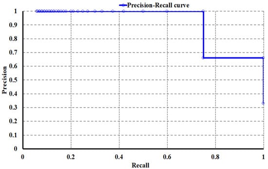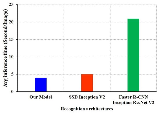 Finally, we calculated the average precision (AP) for all 87 classes and then derived the mean AP (mAP) as the overall performance which can be also plotted in a precision–recall curve by taking the IoU threshold = 0.5. As shown in Equation (9), we analyzed the localization loss using focal loss (FocalL), where is the probability of predicted class and optimal value of gamma γ = 1.5. In addition, the inference time of the designed model is observed.