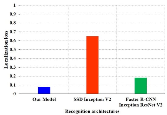 Based on the precision–recall curve, we tried to estimate the area under the curve (AUC) using AP. The AP was measured for all 87 classes. Due to the large number of classes, we calculated the average AP for all types of dishes, as shown in Table 6. Due to the high number of classes or number of food items, the single-dish category still had high AP = 0.88 for all 56 classes, whereas mixed-dish had much better AP = 0.96. Moreover, the localization loss of the designed model was calculated. As shown in Figure 4, our model loss calculation was the lowest <0.1 in comparison to SSD Inception V2 and Faster R-CNN Inception ResNet V2.