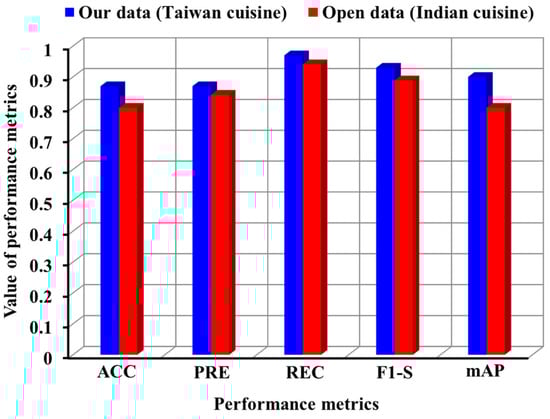 In order to justify the robustness of our proposed detection model, we analyzed the performance by using the open dataset. Since we considered the local Taiwanese cuisine for detection, local Indian cuisine [47] was considered to implement and compare our model. We implemented our food recognition model on the single-dish images obtained from the Kaggle dataset [48]. This dataset comprises 10 food items with 100 numbers of images. Those 10 items are Rasgulla, Modak, Misi_roti, Kalakand, Imarti, Gulab_jamun, Chikki, Bandar_laddu, Aloo_tikki, and Adhirasam. Training and testing data division followed the same procedure as described in Section 3.1. As shown in Figure 6, it is observed that the performance of our model using our dataset has similar performance with the open dataset. Based on the test set, our model implemented on the images of the open dataset can achieve an accuracy (ACC) = 0.8, precision (PRE) = 0.84, recall (REC) = 0.941, F1-score (F1-S) = 0.88, and mAP = 0.8. These results prove that our model can be implemented to recognize a variety of single-dish images of other countries’ cuisines.