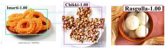 Considering the testing set of images from the open dataset, detection of some of the single-dish food types of Indian cuisine is shown in Figure 7. It is observed that our food detection model can accurately recognize the single dishes Imarti, Chikki, and Rasgulla with a higher confidence score.