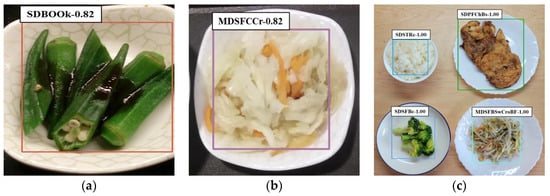 Based on the model, the predicted results are presented in the testing set. The results are presented in three different dish types, i.e., single-dish, mixed-dish, and multiple-dish meals as shown in Figure 8a–c, respectively. Each dish in Figure 8 has a bounding box with a colored square and the top-left label on the box describing the abbreviation of the dish name with a specific confidence score ranging from 0.00 to 1.00.