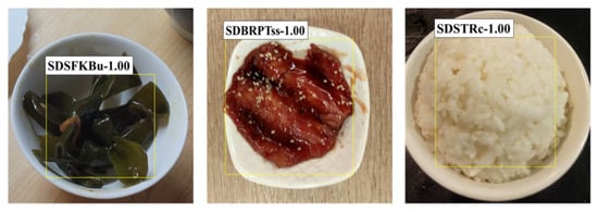 Figure 9 shows three different food items in the type of single-dish. The model is able to recognize correctly the dish name with the information on the type of dish, e.g., single-dish, way of cooking, e.g., stir-fried, and food item, e.g., kelp buds. For instance, “SDSFKBu” was “Single Dish Stir Fried Kelp Buds”, “SDBRPTss” was “Single Dish Braised Pig Trotters with Soy Sauce”, and “SDSTRc” was “Single Dish Steamed Rice”. The confidence score was 1.00.
