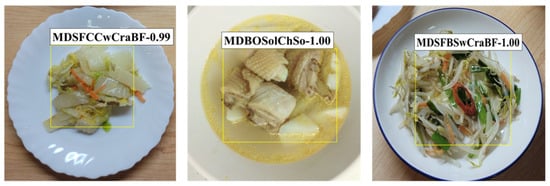 As for the mixed dishes shown in Figure 10, the three mixed-dish items were “MDSFCCwCraBF” standing for “Mixed Dish Chinese Cabbage with Carrot and Black Fungus”, “MDBOSolChSo” for “Mixed Dish Boiled Sesame Oil Chicken Soup”, and “MDSFBSwCraBF” for “Mixed Dish Stir Fried Bean Sprout with Carrot and Black Fungus”. Each dish had a confidence score of 0.99, 1.00, and 1.00, respectively.