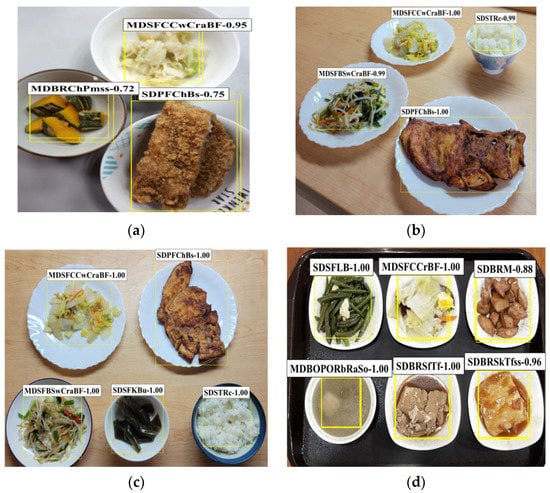 For multiple dishes, we tested different sets that had different numbers of dishes (T). The model recognized multiple dishes with a total number of T = 3, T = 4, T = 5, and T = 6 dishes, as shown in Figure 11a–d, respectively. As a result, all the prediction results have a confidence score larger than >0.5. For instance, as shown in Figure 11b, the designed model recognized correctly “SDSTRc” and “SDPFChBs” for single-dish and “MDSFCCwCraBF” and “MDSFBwCraBF” for mixed-dish with an average confidence score of = 0.99. In Figure 11, prediction results appear for each dish where the same prediction class did not repeat for the same dish.
