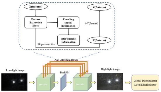 In this study, we propose several innovative techniques. First, we choose a more complex network structure on the GAN generator. Based on U-net [10], we add an anti-attention block (AAB) to our generator. AAB makes the network deeper, learns features in more detail, and focuses more on the dark parts of the picture. Second, we join the DAPPM [11] block, which increases the transmission of the information at different scales. Finally, we design multiple loss functions. The exposure consistency loss function is added to restrain under/overexposed regions. It also adjusts to well-visual image exposure and gives more weight to dark areas. The color consistency loss function is added to minimize color deviations. The space consistency loss function is added to enhance spatial coherence.