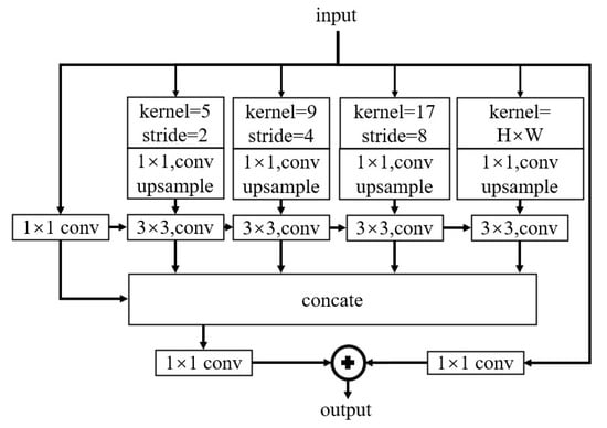 U-Net [10] has many successful applications in the field of computer vision, such as semantic segmentation, image enhancement and GAN. By extracting multi-level features from different network layers, U-Net can recover lost information from the convolutional subsampling, retain rich texture information, and synthesize high-quality images. The U-Net structure is also employed in AABGAN as an encoder and decoder. We used AAB before each max pooling layer and upsampling layer of U-Net. In addition, we use DAPPM [11] in the middle of U-Net. The structure of DAPPM is shown in Figure 4. DAPPM is based on PSPNET’s [29] feature pyramid pooling and RES2NET [30]. It can be observed as multiple feature scale modules and pyramid pooling, thus increasing the acceptance domain and integrating multi-scale feature information. The ablation experimental results show that the DAPPM module can improve the visual performance of images, as described in Section 4.