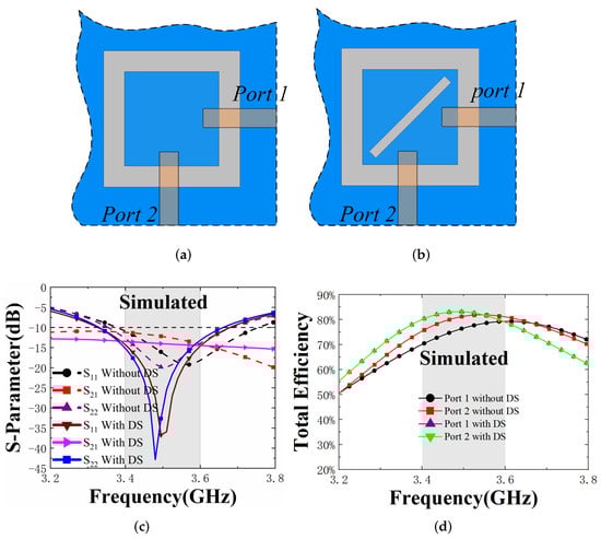 In this paper, the 3D full-wave electromagnetic simulation software ANSYS HFSS 2020 R1 is used for the simulated design and optimization of the antenna. As shown in Figure 2a, firstly, structure one has only a square loop slot etched in the ground (the outer length of the square loop slot is L and the inner length is S). When only one square ring slot is used as a radiator, it can be seen from Figure 2c that Ports 1 and 2 have a degree of resonance of −20 dB at 3.5 GHz, and the isolation is just under −10 dB. Then, as shown in Figure 2b, a diagonal slot is etched in the internal square rectangle, causing a sharp drop in the resonance to −43 dB (Port 1), −37 dB (Port 2), and a drop for the isolation to −14 dB. In addition, it can be seen from Figure 2d that the inclusion of the diagonal slot increases the TE of the antenna by approximately 10%, making the inclusion of the diagonal slot a sound choice.