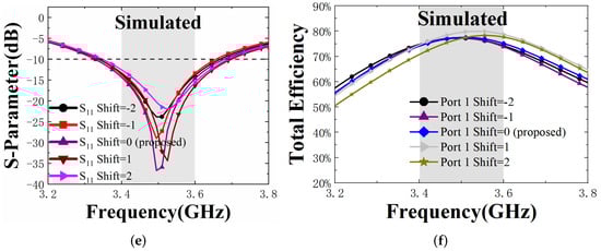 The third group is the upper and lower offset shift of the feed line. As shown in Figure 3e,f, we can see that the offset of the feed line position of Port 1 changes from −2 mm to 2 mm, and the position of the feed line affects the degree of the resonance matching; however, it has little effect on the TE, and the TE changes only slightly. In the end, shift = 0 mm is chosen.