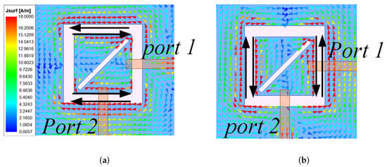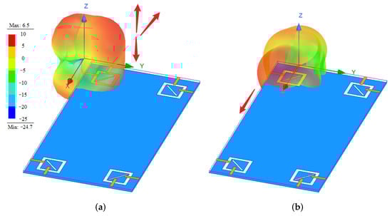 As shown in Figure 4, both Ports 1 and 2 can form two slot antennas while operating individually, and their current directions are shown by the solid black arrows. In Figure 4a, it can be seen that the two slot currents are along the horizontal direction when Port 1 is excited, while being along the vertical direction when Port 2 is fed in Figure 4b. This phenomenon of orthogonal surface currents is a visual indication that the antenna has a dual polarization. To further explain the high isolation, Figure 5 gives the 3D radiation patterns generated when Ports 1 and 2 are excited separately. As can be seen from Figure 5a, when Port 1 is excited, the radiation direction is mainly in the −x-direction and ±z-direction, while when Port 2 is excited, the radiation direction is mainly +x-direction. This phenomenon indicates that the largest radiation regions are not to be crossed, thus producing high isolation (simulated isolation is better than 14 dB) without an extra decoupling structure.
