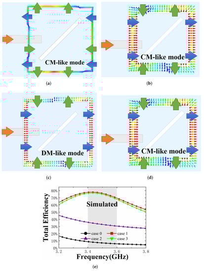 To explain the mechanism of how the TE is affected and the reason for the high TE, the study uses the method of CM/DM. Firstly, the antenna structure is unchanged, but the excited method is changed. Then, the study applies a pair of excitations at the square loop slot (the orange arrows in the Figure 6 represent the direction of the feed) and study the electric field distributions. It should be noted here that the DM consists of applying a pair of excitations with the same amplitude and 180 degrees out of phase, and the CM consists of applying a pair of excitations with the same amplitude and equal phase.