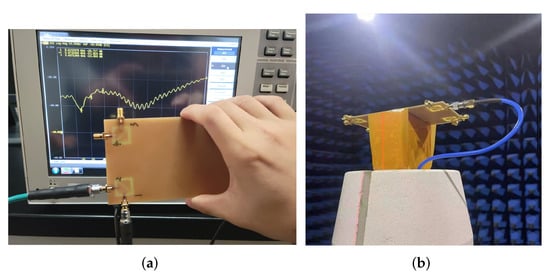 Photograph of (a) test use of the vector network measurement analyzer. (b) Test in the anechoic chamber.