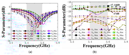 Simulated and measured S-parameter of the proposed antenna. (a) Reflection coefficients. (b) Transmission coefficients.