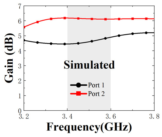 Figure 9 shows the simulated and measured S-parameters, respectively. Due to some manufacturing and welding errors, the measured data are somewhat different from the simulated data. It can be seen that the measured can cover the 3.5 GHz (3.4–3.6 GHz) frequency band. Even though the resonance degree is slightly worse than the simulated data, it also meets the requirements of the mobile phone antenna. The measured isolation is better than 17 dB. Since the resonance degree is worse than the simulated result, the measured isolation result is 3 dBi better than the simulated result, which is at the expense of the matching degree. Figure 10 shows the gain variation of the proposed antenna in the operating band, and the maximum gains of the two ports are 5.2 dB and 6.24 dB, respectively.