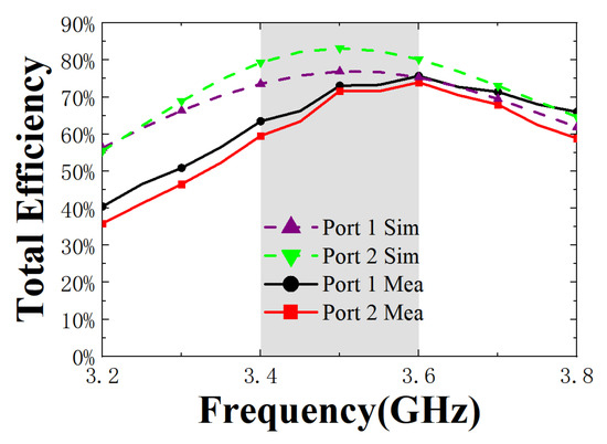 The TE results of the simulation and measurement are shown in Figure 11. It can be seen from the figure that when Ports 1 and 2 are excited, the range of the simulated TE is 75–85%, and the measured result is 60–75%. The measured TE is generally lower than the simulated, which is mainly due to the current skin effect caused by excessive solder and cavity loss.