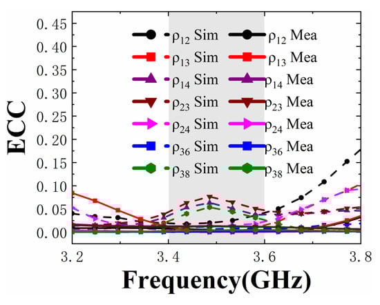 The results of the simulated and measured ECC are shown in Figure 12, and the measured results are basically consistent with the simulated results. All of the simulated and measured ECC is less than 0.065 in the working frequency band, which means that the eight-port MIMO antenna has good MIMO directivity.