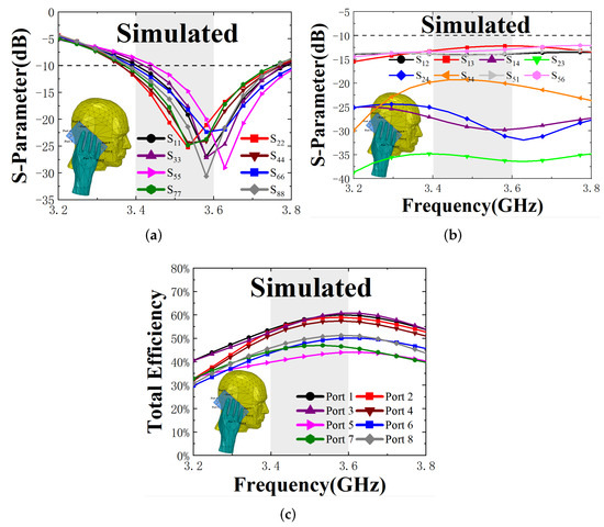 Figure 13 show the corresponding changes of the antenna elements’ performance under the user’s model. As indicated in Figure 13a, the impedance matching of the proposed antenna is not influenced significantly due to the hands not being in contact with the antennas directly. However, the resonant points of some elements which are close to the hand model will slightly deviate from the desired 3.5 GHz, such as the , , , and . However, the isolation between antenna elements worsens, as shown in Figure 13b, which may be due to the hand and head model loading. In addition, the hand and head models can be equivalent to an irregular lossy medium, so part of the radiation power of the antenna is absorbed by the medium, resulting in a decrease in antenna efficiency, as shown in Figure 13c. Due to the absorption of the hand and head media, the TE of some antenna elements adjacent to the medium is reduced to less than 50%. It can be clearly seen from the simulated results that the MIMO antenna performance is closely related to the distance between the antenna element and the hand or head model. The closer the distance, the greater the impact on the bandwidth and efficiency. Nevertheless, the antenna elements, which are far away from the model, still have good performance.